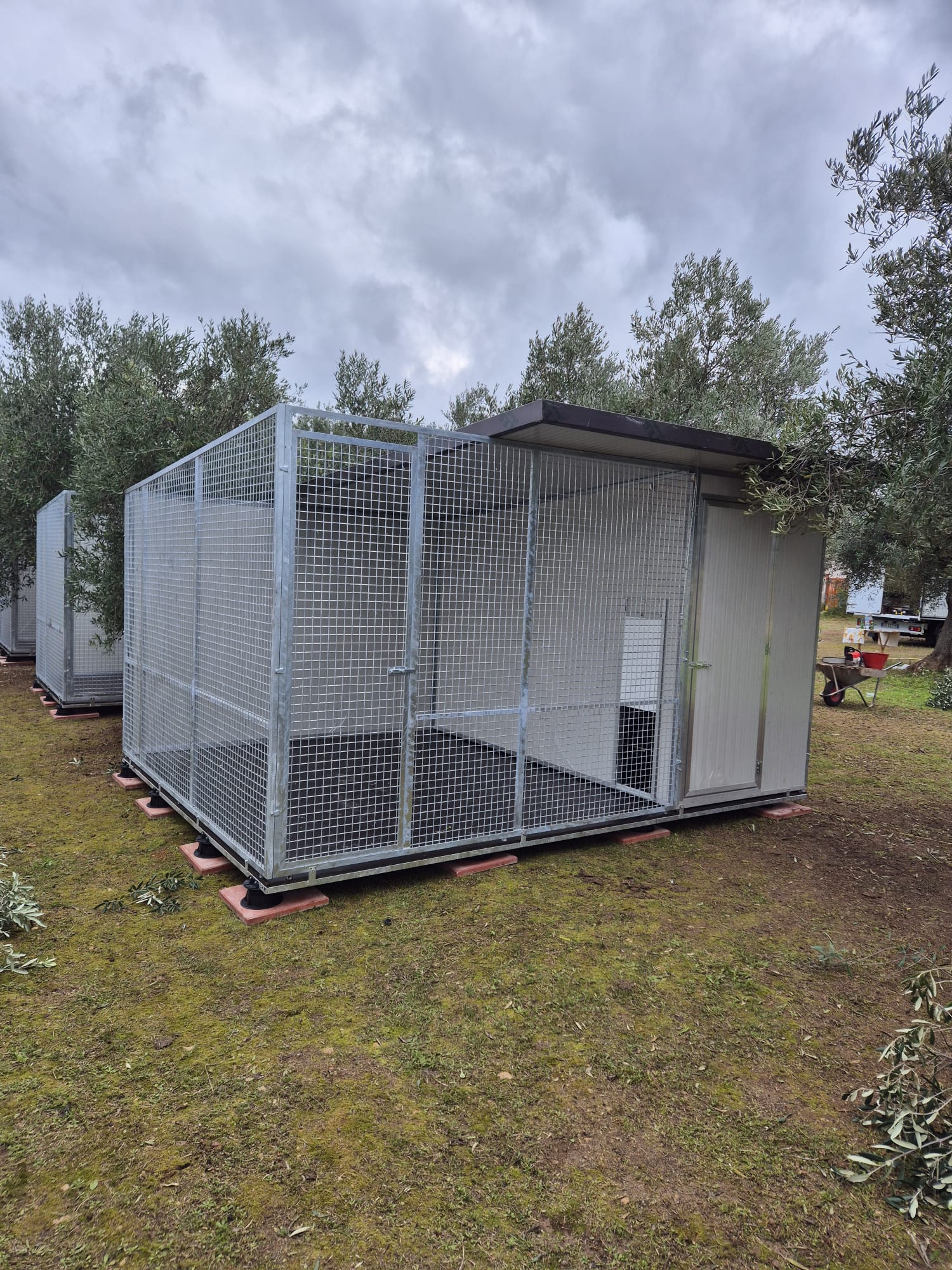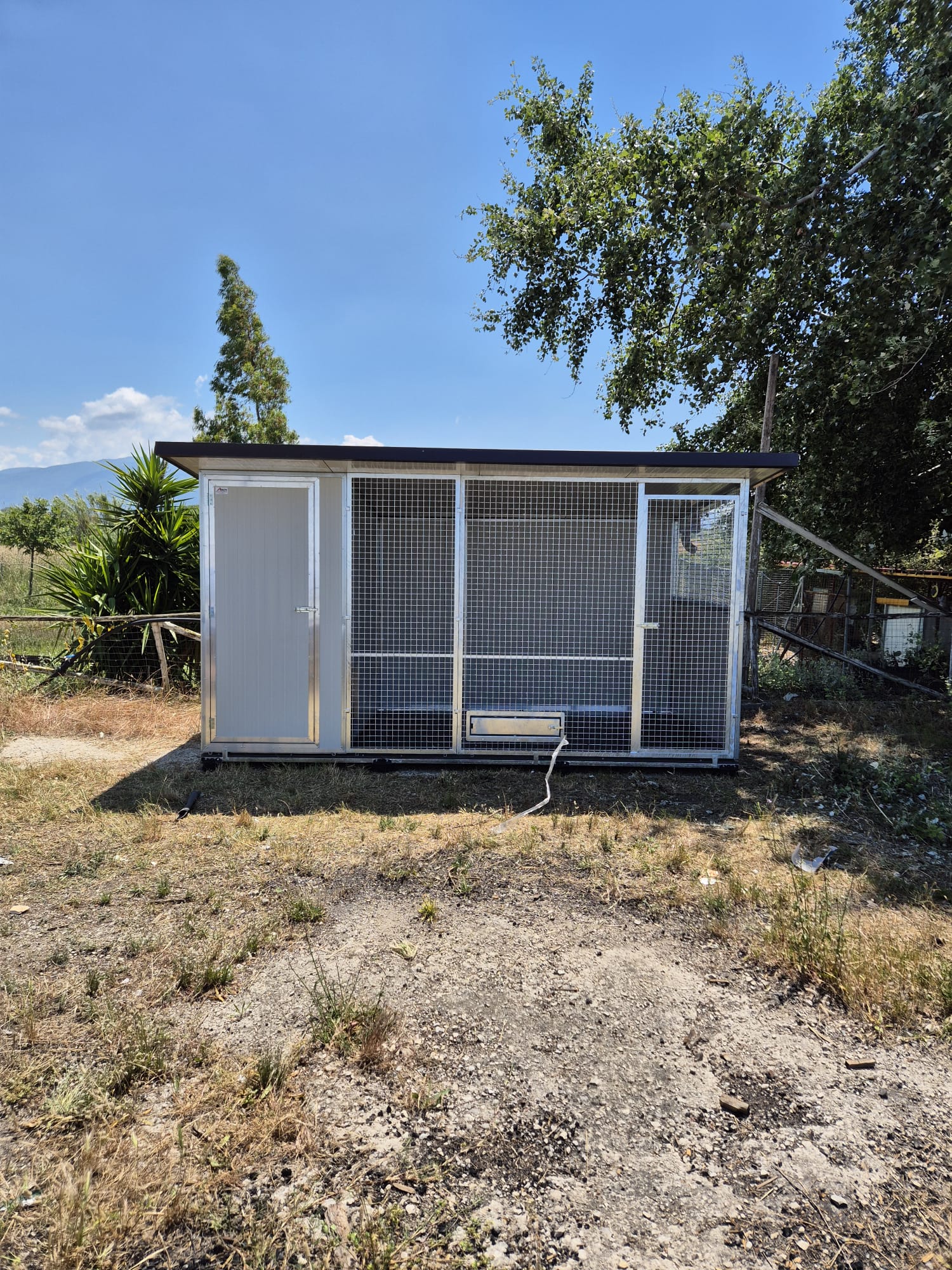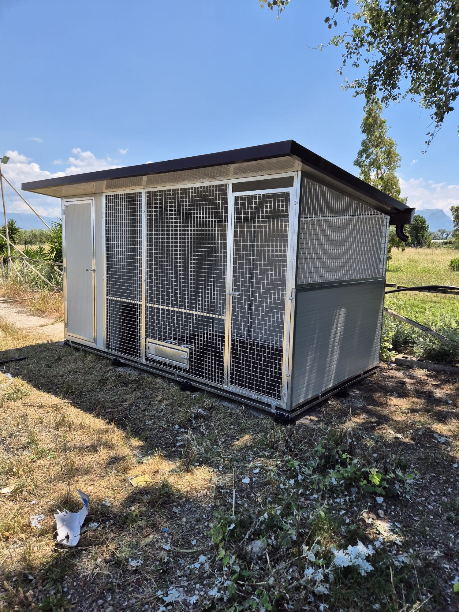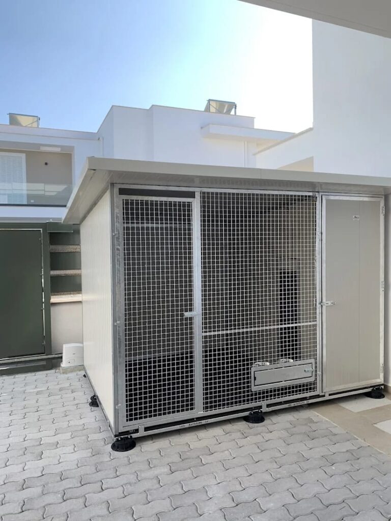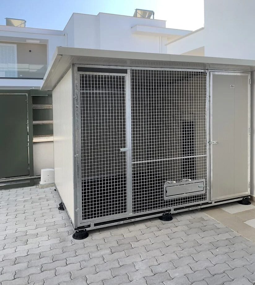 Il Box per cani con zona notte colore Bianco è un modello di box coibentato per cani da utilizzare all’esterno. I lati in pannelli coibentati sono bordati con dei profilati zincati su 3 lati in modo da formare una struttura solida, mentre nella parte inferiore il profilato è in alluminio in modo da evitare la corrosione. Il lato anteriore è diviso da una parte in rete elettrosaldata è bordato con profilati per serramenti con zincatura a caldo ed una parte in coibentato per l’accesso pedonale alla zona notte. Il laterale può andare dal tutto chiuso in pannelli al tutto aperto in rete, passando per soluzioni più personalizzate tipo metà pannello e metà rete sia in verticale che in orizzontale. La Zona Notte è isolata dal box esterno da un unico accesso per il cane. Questo box coibentato per cani è adatto per tutte le stagioni grazie al riparo e all’isolamento che garantisce.