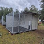 Telai in Rete elettrosaldata con foro 40×40 mm filo 4mm e profilati per serramenti con bagno di Zincatura a Caldo. Porta di accesso fornita di cerniere con piolini sfilabili in modo da permettere un eventuale manutenzione e chiavistelli con alloggio per catenaccio.