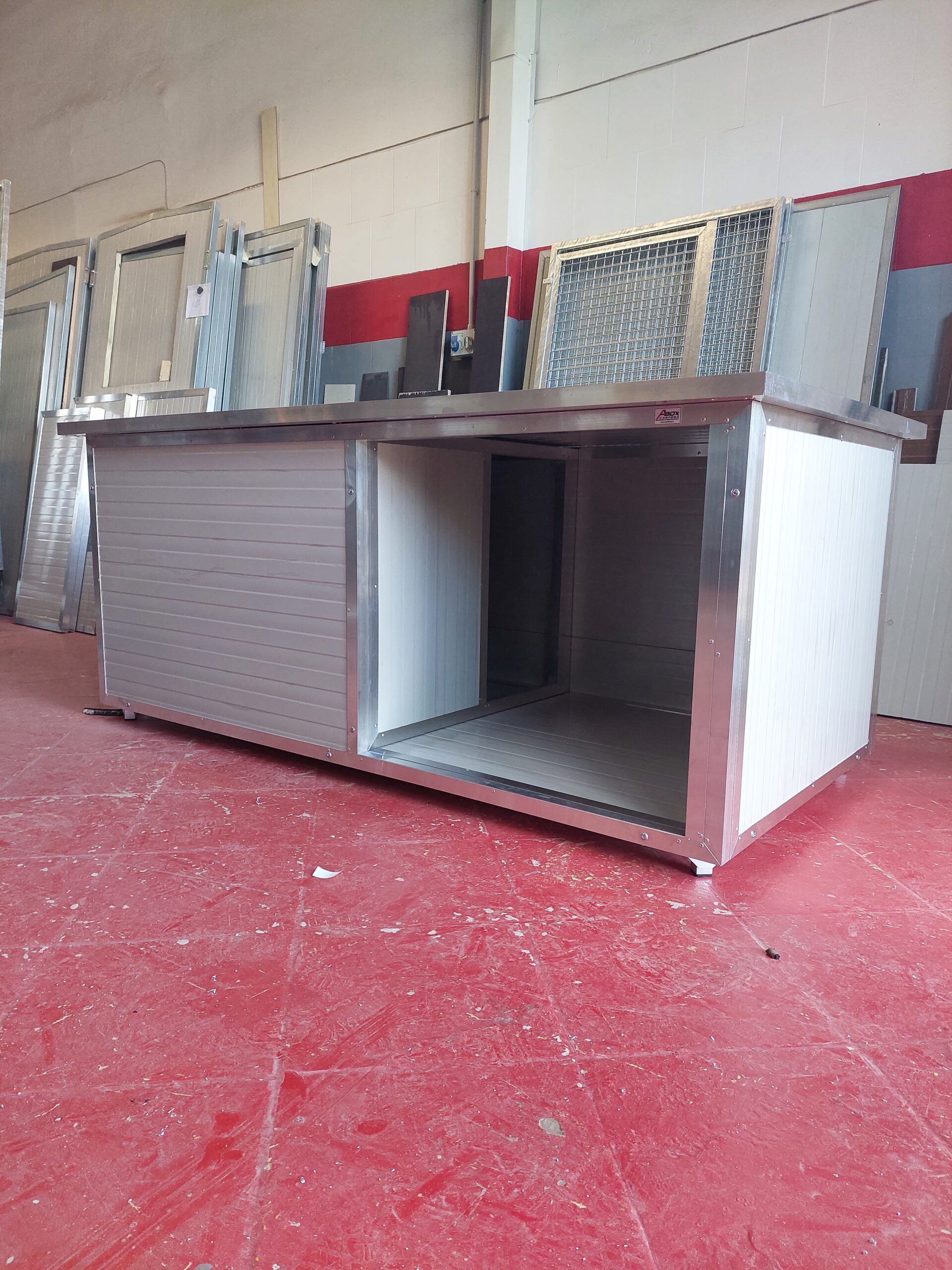 Cuccia per cani coibentata da esterno con veranda garantisce un ottimo isolamento termico sia d’estate che d’inverno. Sono divise in 2 ambienti, uno chiuso e ricoverato per la notte ed un altro più aperto ad uso veranda per il giorno. Sono realizzate in coibentato da 3 cm con profilati in Alluminio 35×35. Completamente smontabili tutte le volte che vuoi grazie al nostro sistema di fissaggio con rivetti filettati, il tetto è apribile per permettere l’ispezione ed è rialzata da terra con piedini di 5 cm (su richiesta regolabili). E’ compresa di asta per sostegno tetto.